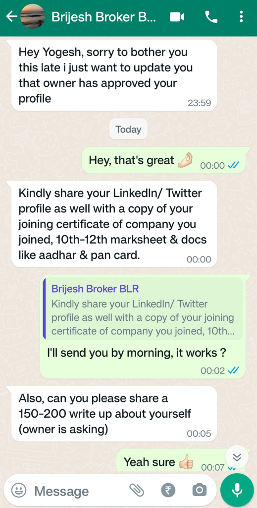 பெங்களூருவில் யோகேஷ் என்ற நபர் வாடகைக்கு வீடுதேடி அலைந்துள்ள நிலையில், இதற்காக வீடு தேடித்தரும் பிரிஜேஷ் என்ற புரோக்கரை அணுகியுள்ளார். அவரும், ஒரு வீட்டின் உரிமையாளர் வீடு தர சம்மதித்துவிட்டதாகவும், யோகேஷின் லிங்கிட்-இன் மற்றும் ட்விட்டர் அக்கவுண்டுகளையும், பணிபுரியும் நிறுவனத்தின் அப்பாயின்மெண்ட் ஆர்டர் மற்றும் 10,12ம் வகுப்பு மதிப்பெண் சான்றிதழ்களையும் அனுப்பக் கூறியுள்ளதாகவும் தெரிவித்துள்ளார். மேலும் அவரது சுயவிவரக் குறிப்பு ஒன்றையும் கேட்டுள்ளார்.